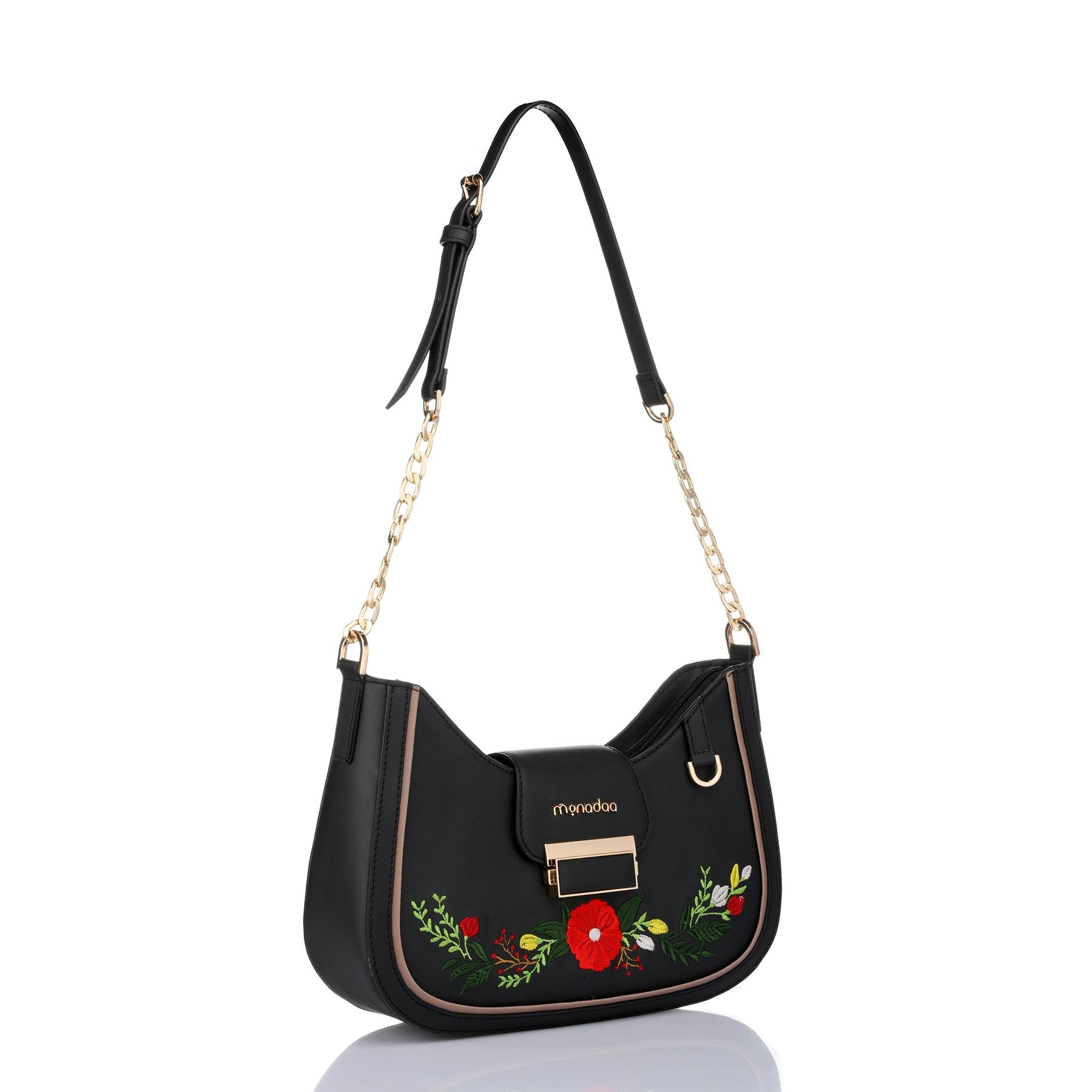 Inject positivity and perk up your everyday look by adding this vibrant floral embroidered moon bag to your new season wardrobe. Made for style mavens who are ready for a new style challenge, this attractive bag also comes with a gold tone chunky chain handle that will add edgy elegance to any look. It also gets bonus points for its charms and twisted-lock closure.