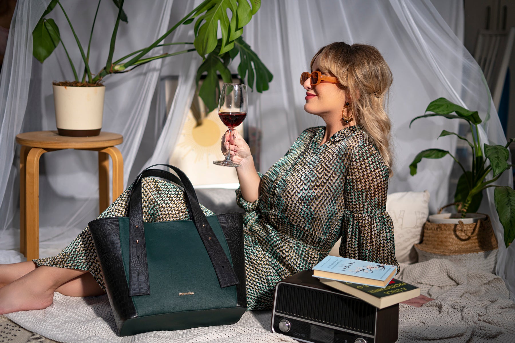 This spacious evening tote bag displays tablet studs on front and branding on back for the elegant look. This monadaa bag is big in capacity and long lasting. accommodate your stuff, it comes with spacious compartments with zipper pocket and internal organizer .Top meatllic closure and versatile wide shoulder handle it is easy to organize and stylish to carry that completes the overall look of the bag .It is highlighted with gold metal detailing. Closure: Magnet Colour: Green,Tan Interior: 1 zip pocket, slip pocket &card slots Hardware: Gold Type: Tote bag size: L-32cm,W-13cm,H-30cm Material: Synthetic leather polyuthrene(P.U)